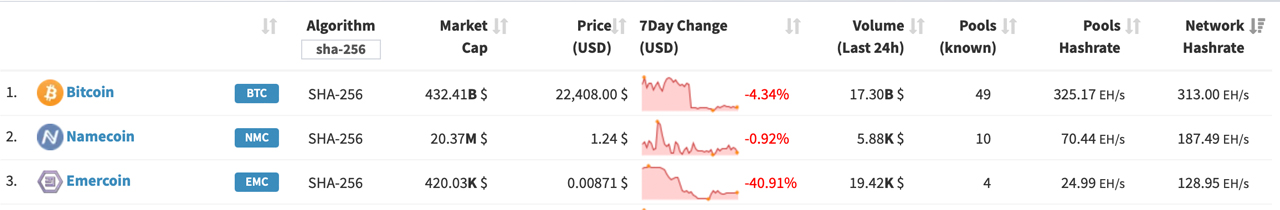 Bitcoin’s hashrate secures the network and provides rewards for miners participating in the system, but mining pools also dedicate computational power to networks like Namecoin, Elastos, Emercoin, and Vcash. For example, Namecoin has a hashrate of around 187 EH/s today, and some of the top bitcoin mining pools merge-mine the network to acquire namecoin (NMC) rewards.
