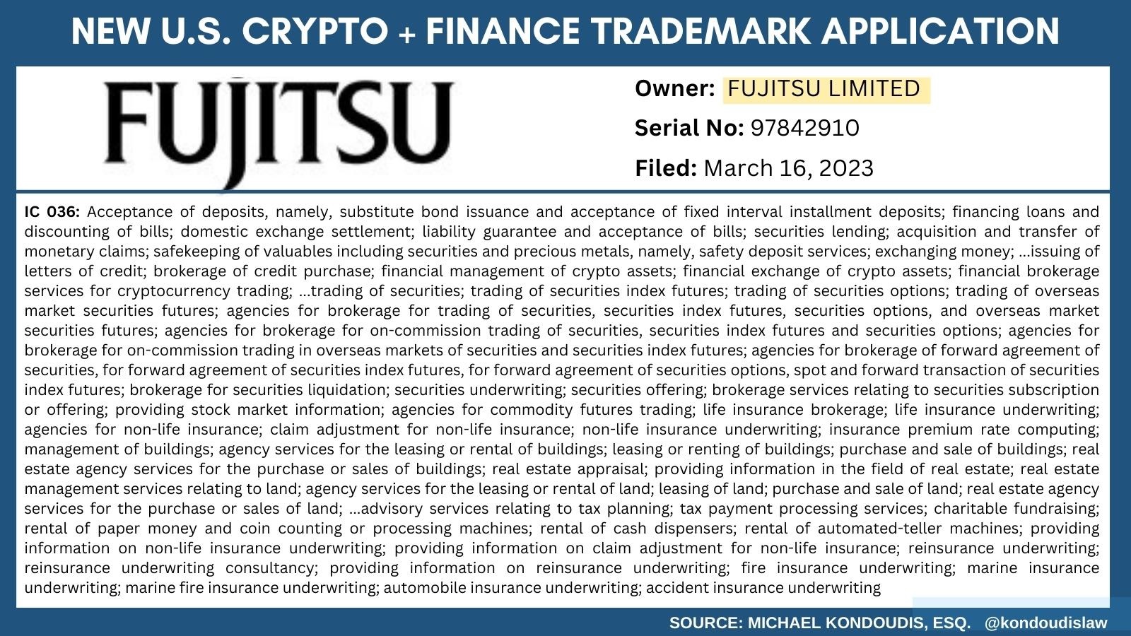 Is Fujitsu moving into banking, finance & crypto? The international tech co has filed a trademark application for exchanging money, securities trading, insurance brokerage, tax planning, [and] cryptocurrency trading.