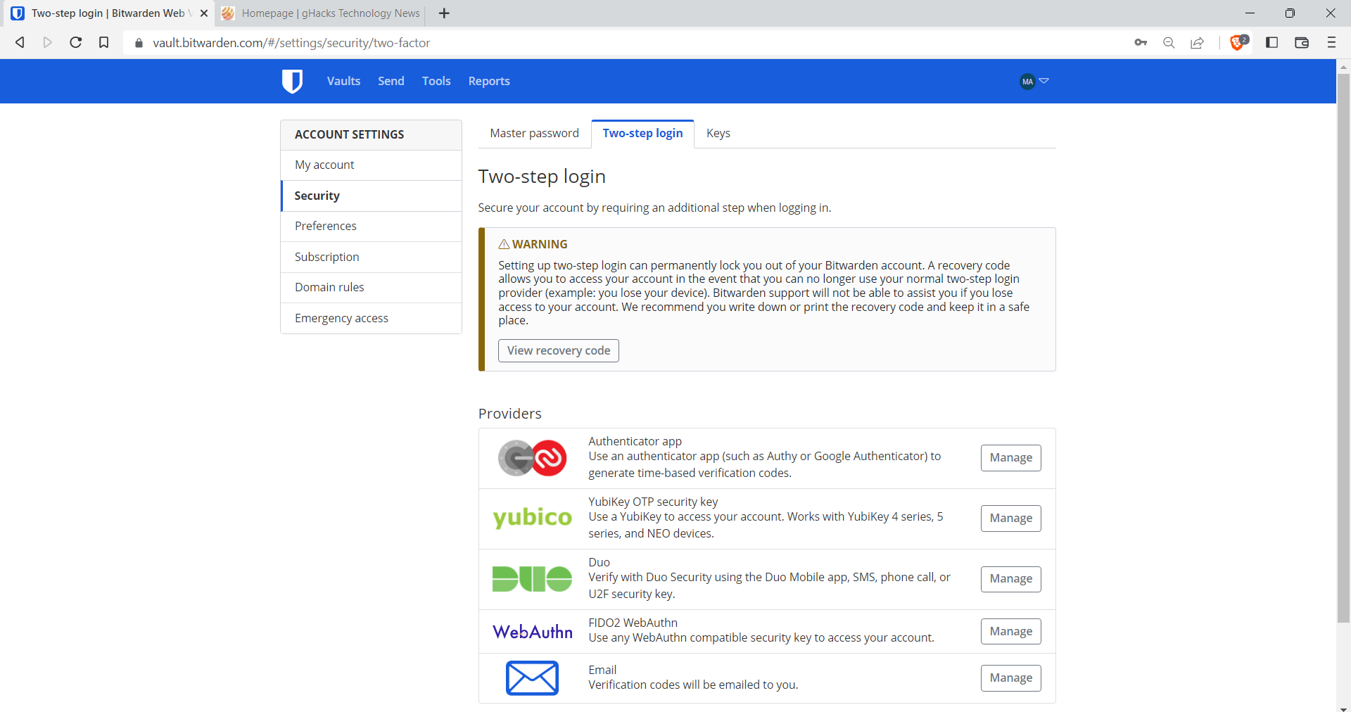 How to add a backup two-step login provider to Bitwarden