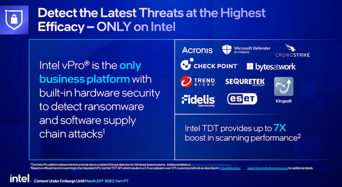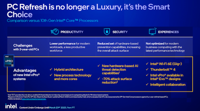 Every time Intel launches a new desktop or mobile platform, they typically roll out an updated Intel vPro platform to match, and their 13th Gen Core series is no different. Designed to offer updated hardware-level securities to their existing 13th Gen Core series SKUs, Intel also has a new initiative that they are calling ‘Ready for Refresh,’ where through an in-house commissioned analysis, vPro users looking to upgrade can save up to 14% on the 5-year cost of operations per PC. Intel’s 13th Gen vPro also claims up to 93% efficacy in detecting ransomware attacks in real-time through its new Intel Threat Detection technology and promising users and businesses a smooth transition to Microsoft’s Windows 11 from the previous Windows 10 operating system.