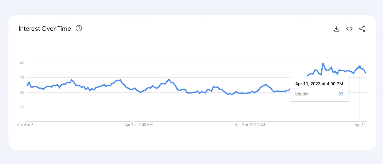 According to worldwide data from Google Trends, the search term “bitcoin” has reached a score of 93 out of 100 in the last seven days. Additionally, the price of bitcoin rose above the $30,000 range for the first time in ten months, or since June 2022.