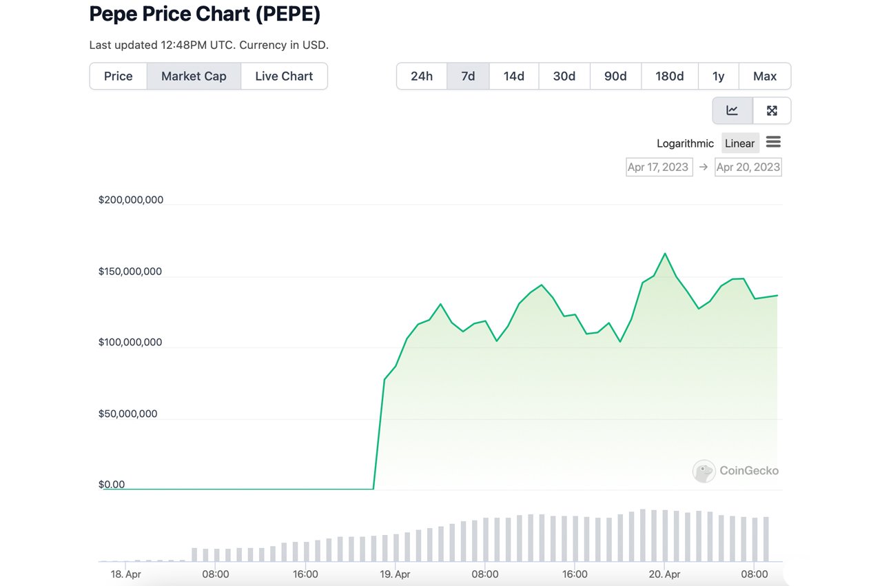 Doge and the other dog friends in the meme economy have a new companion, but this time, the newcomer is a frog, specifically Matt Furie’s Pepe the Frog. The coin pepe (PEPE) has not been around for long, appearing on the scene on April 18, 2023. According to current statistics, PEPE is up more than 400% from the coin’s all-time low on the day it started trading. Two days later, on April 20, PEPE’s market valuation reached a high of $165 million. The number of pepe tokens in circulation is 420.69 trillion, and at the time of writing, there are 29,756 PEPE holders.