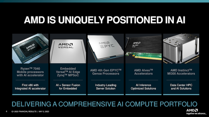 Finally, outside of direct financial matters, the most recent earnings cycle has also seen push their AI product narrative a bit harder. Driven in part by antsy shareholders – who have been eyeing the high margins and growth opportunities over at NVIDIA and other AI-adjacent rivals – AMD has been putting extra effort in promoting their AI efforts and current product stack. In some respects, this is an effort to calm investors until Instinct MI300 ships late this year – which should be AMD’s best chance yet to break into the high-end AI training/inference market – but it also reflects an increase in interest from the company. As noted during AMD’s conference call, Victor Peng, Xilinx’s former CEO, has recently been placed in charge of all of AMD’s AI efforts. So while AMD isn’t announcing any new AI roadmaps, it’s clear that they are banking on Xilinx and Peng’s expertise in the area to improve their position in the long run.
