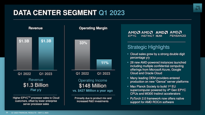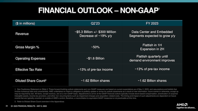 As with rival Intel, the drop in client sales is being compounded by AMD’s OEM customers working to reduce their own inventories, meaning that they’re ordering fewer chips to replace what they do sell. So AMD has far fewer opportunities to sell chips so long as that customer inventory bubble remains. Client ASPs are also down YoY, though AMD isn’t specifying by how much. The one bit of good news here is that AMD believes that they’ve finally hit the bottom of the client sales collapse in Q1. If AMD is right, it will still take until the second half of the year before they recover, but it means the company is going to be able to put the worst behind them and things only get better from here.