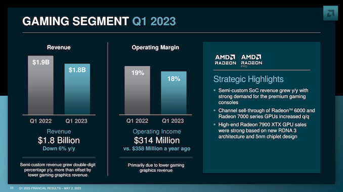 The operating income for the segment did take a hit, however, dropping by 65% to $148M, a margin of just 11%. The relatively high margins on data center products to begin with has allowed AMD to stay in the black on this segment, albeit thinly. Propping up the segment for Q1 has been higher EPYC CPU sales to cloud customers, counteracting a drop in sales with enterprise customers. AMD’s new EPYC 9004 Genoa processors were also shipping in this quarter, though it doesn’t sound like they had a huge impact on AMD’s bottom line quite yet, as customers are still ramping up server production. It’s also worth noting that, following the Xilinx acquisition, AMD books part of their FPGA revenues here – basically, any product aimed at data center customers falls under this segment – so it’s likely AMD is also enjoying some year-over-year revenue stability thanks to those sales.
