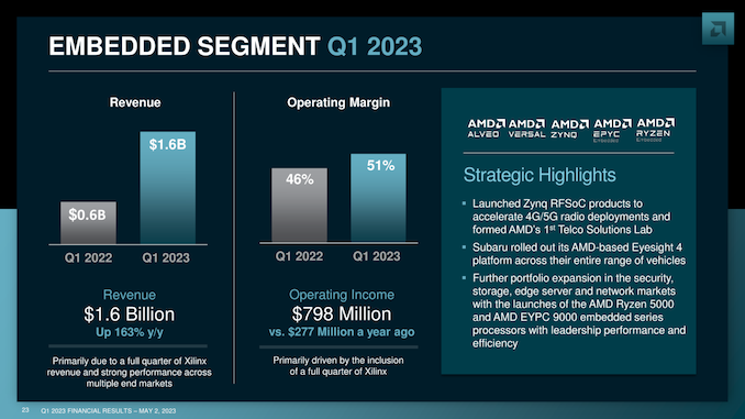For Q1’23, the Embedded segment booked $1.6B in revenue and $798M in operating income, which is an increase of 163% and 188% respectively. Despite the downturn in tech spending, ex-Xilinx products have proven to be relatively better insulated with regards to sales consistency. But more significant still is that embedded products are fetching very high margins – the segment’s operating margin was 51%, far better than any of AMD’s other segments. This kind of consistency and market opportunity is a big part of why AMD wanted to acquire Xilinx in the first place, and that bet is paying off by keeping AMD a bit steadier during this larger tech spending downturn.