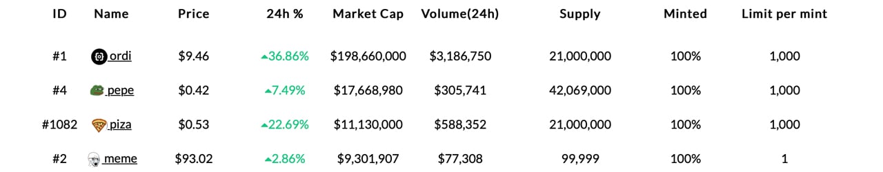 Pepe, another BRC20 coin (not to be confused with the ERC20 meme coin with the same name), has a market capitalization of around $17.6 million. The top five BRC20 token market valuations, which include ordi, pepe, piza, meme, and moon, account for 86.55% of the $279.07 million total. Not only is ordi the top BRC20 coin in terms of market capitalization, but it has also generated $3.1 million in 24-hour trade volume.