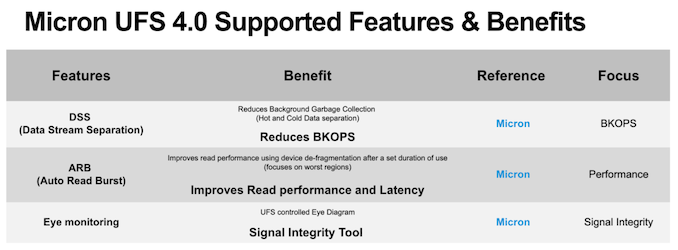 The new UFS 4.0 storage modules from Micron are fully compliant with the specification and use two M-PHY Gear 5 lanes for data transmission. In addition, they support such proprietary firmware capabilities as Data Stream Separation (separates frequently used and rarely data on the device to reduce background garbage collection), Auto Read Burst (improves read performance by using device de-fragmentation after it is used for a long time), and Eye Monitoring (ensures signal integrity).