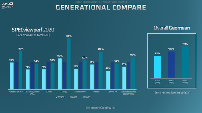 First off, kudos to AMD here for being honest with their generational performance comparison; rather than cherry-picking results or ignoring the subject entirely, they’re publishing a complete data set. But their SPECviewperf 2020 results underscore the inconstant performance gains going from one generation to the next. The W7600 flies in compute-bound workloads thanks to the card’s greater memory bandwidth and compute throughput, but elsewhere regresses on three of the sub-tests. While I haven’t tested either card personally, based on what I know about these tests an AMD’s specifications, this is likely a result of the lower boost clockspeed of the W7600, leading to slower performance in both the front and back-ends of the pixel rasterization pipeline. According to AMD, the W7600 still comes out ahead overall by 19%, though it’s certainly a smaller generational uplift than we’ve seen in other pro parts.