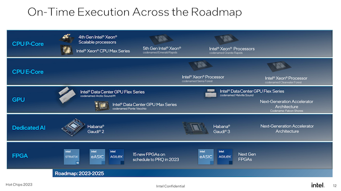 Above all else – and, perhaps, letting marketing take the wheel a little too long here for Hot Chips – Intel is hammering home the fact that their next-generation Xeon processors remain on-track for their 2024 launch. It goes without saying that Intel is just now recovering from the massive delays in Sapphire Rapids (and knock-on effect to Emerald Rapids), so the company is keen to assure customers that Granite Rapids and Sierra Forest is where Intel’s timing gets back on track. Between previous Xeon delays and taking so long to bring to market an E-core Xeon Scalable chip, Intel hasn’t dominated in the data center market like it once did, so Granite Rapids and Sierra Forest are going to mark an important inflection point for Intel’s data center offerings going forward.