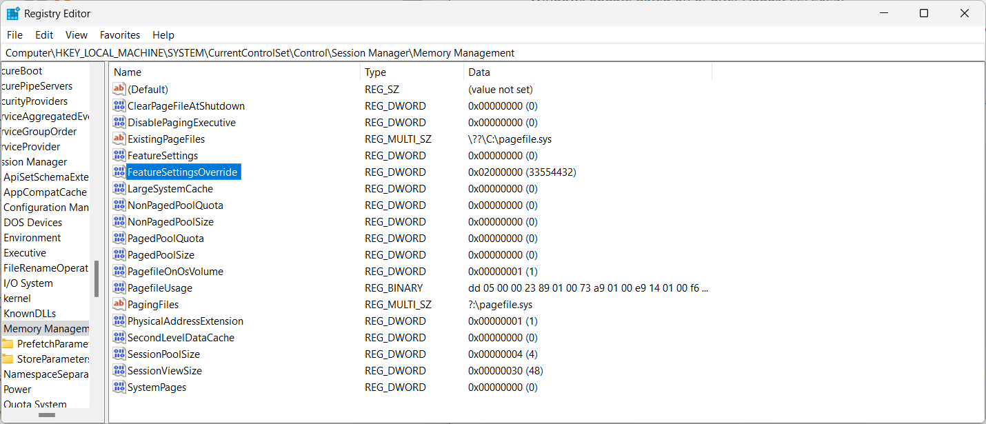 reg add “HKEY_LOCAL_MACHINESYSTEMCurrentControlSetControlSession ManagerMemory Management” /v FeatureSettingsOverride /t REG_DWORD /d 33554432 /f