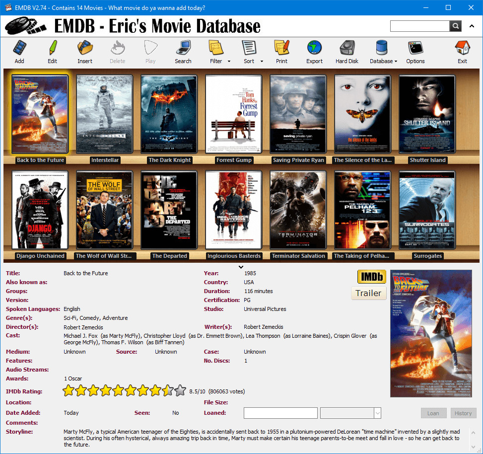 EMDB is an application to keep track of your movie and TV Series collection. Both physical discs and media files are fully supported. With an automatic import from the database of IMDB, export to csv, text or HTML, thumbnail cover preview, a loan tracker, advances search and filter functions and multi-language user interface. EMDB doesn’t need a .NET framework or any other external libraries and is therefore fully portable. And best of all… it’s free!.