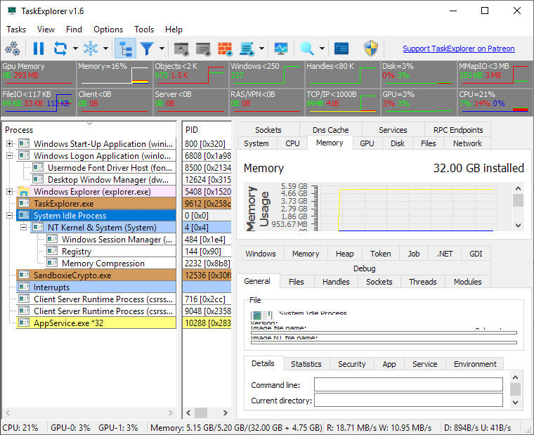 Task Explorer is an advanced Task Manager tool with emphasis on, not just monitoring what applications are running, but on finding out what applications are doing. The UI focuses on expedience and getting real time data of what the processes are doing at any given moment. Relevant data are provided in easy to access (as less clicks as possible) panels, with no need to open windows or windows of sub windows, instead additional information’s for selected entries are shown in the lower half of the panel. Allowing to browse the detailed information’s using arrow keys. And most data are refreshed continuously, as seeing the dynamic of values often grants additional insight.