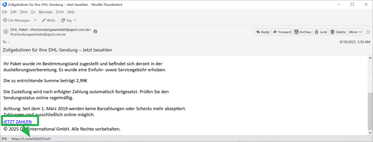 Apart from the sender’s email, it is the link that provides you with additional information. It screams fake, and if you used DHL before, you know that the company does not use the t.co URL shortening service.
